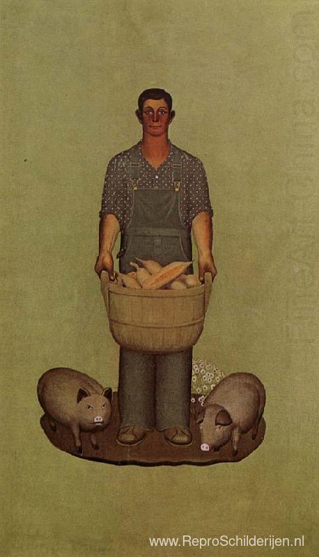 Wij bieden u een ambachtelijke reproductie op doek van het beroemde schilderij 'Iowa-product' van Grant Wood, afkomstig uit het Reproductiemuseum.