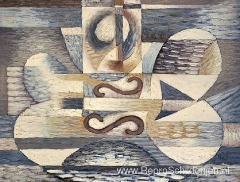 Wij bieden u een ambachtelijke reproductie op doek van het beroemde schilderij 'De reflectie van de viool' van Serge Charchoune, afkomstig uit het Reproductiemuseum.