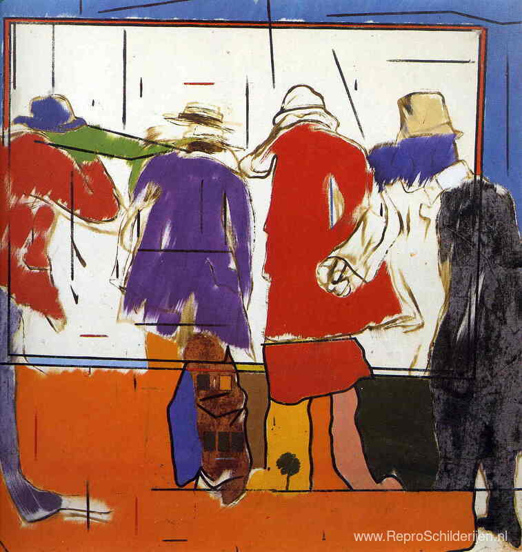 Wij bieden u een ambachtelijke reproductie op doek van het beroemde schilderij 'De vriendschap en de schaduw van verraad' van R. B. Kitaj, afkomstig uit het Reproductiemuseum.