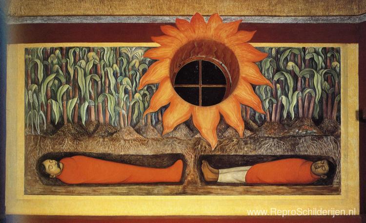 Wij bieden u een ambachtelijke reproductie op doek van het beroemde schilderij 'Het bloed van de revolutionaire martelaren die de aarde bevrucht' van Diego Rivera, afkomstig uit het Reproductiemuseum.