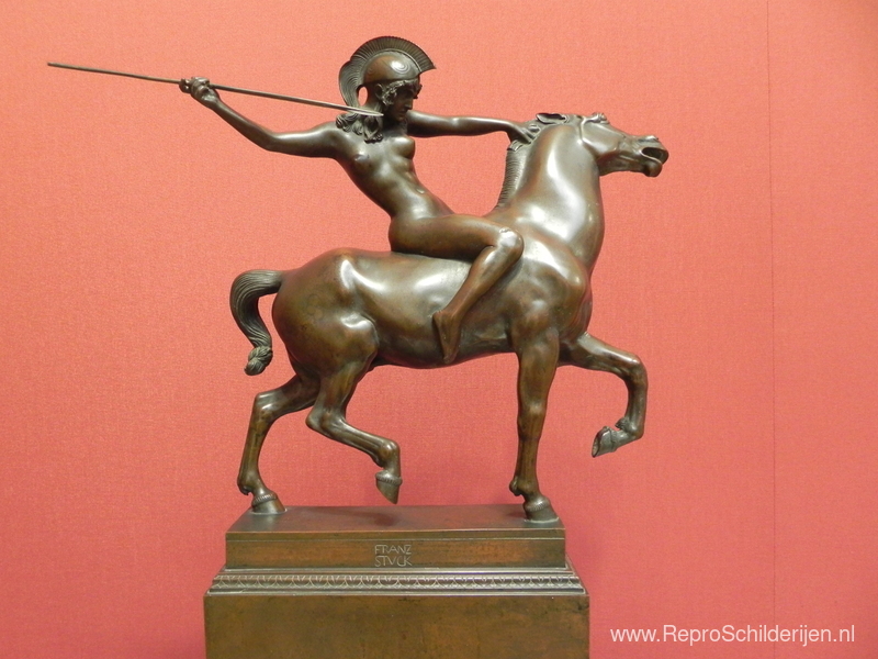 Wij bieden u een ambachtelijke reproductie op doek van het beroemde schilderij 'Amazone te paard' van Franz Stuck, afkomstig uit het Reproductiemuseum.