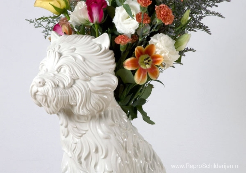 Wij bieden u een ambachtelijke reproductie op doek van het beroemde schilderij 'Puppy vaas' van Jeff Koons, afkomstig uit het Reproductiemuseum.