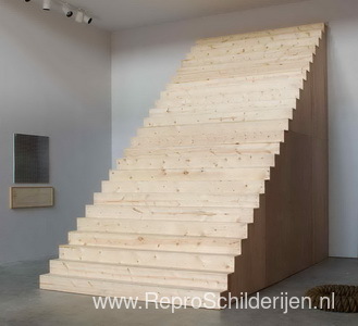 Wij bieden u een ambachtelijke reproductie op doek van het beroemde schilderij 'Trappen (deze trappen kunnen worden beklommen)' van Alice Aycock, afkomstig uit het Reproductiemuseum.