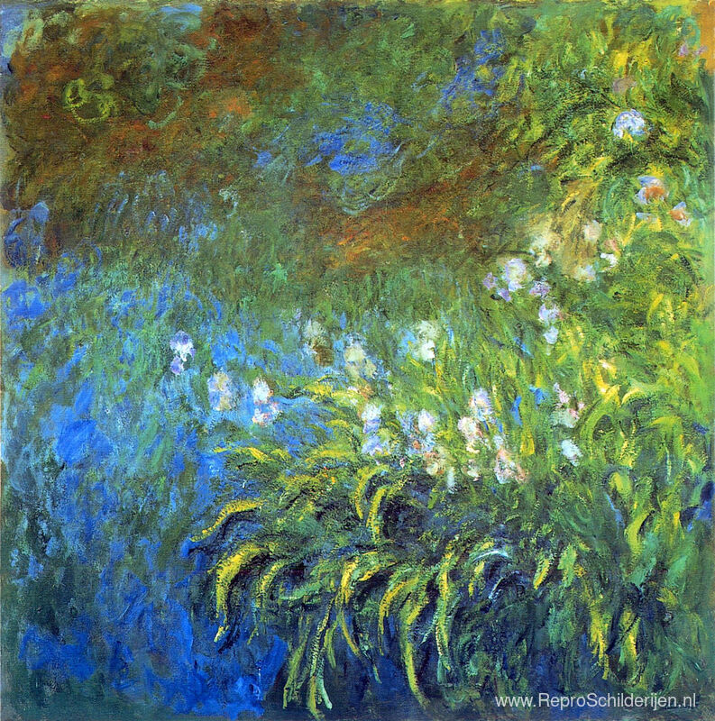 Wij bieden u een ambachtelijke reproductie op doek van het beroemde schilderij 'Iris bij de Zee-Rozenvijver' van Claude Monet, afkomstig uit het Reproductiemuseum.