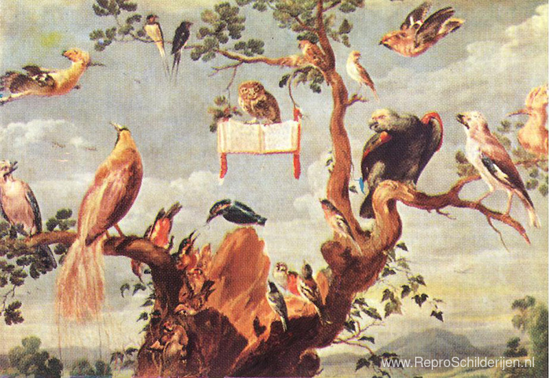 Wij bieden u een ambachtelijke reproductie op doek van het beroemde schilderij 'Concert Van Vogels' van Frans Snyders, afkomstig uit het Reproductiemuseum.