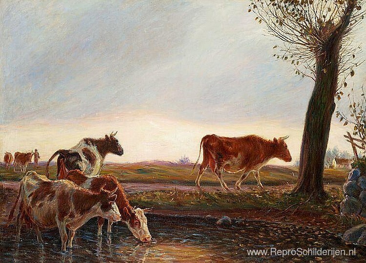 Wij bieden u een ambachtelijke reproductie op doek van het beroemde schilderij 'Koeien gaan 's avonds huiswaarts' van Theodor Philipsen, afkomstig uit het Reproductiemuseum.