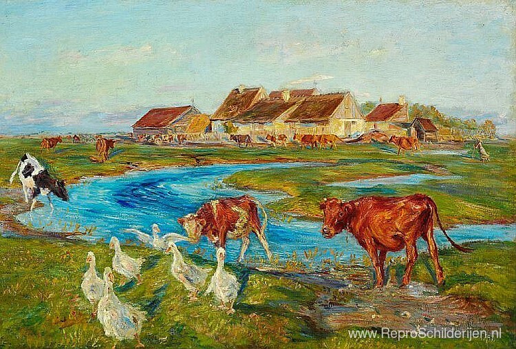 Wij bieden u een ambachtelijke reproductie op doek van het beroemde schilderij 'Naar huis tijdens het melken. Avond. Saltholm' van Theodor Philipsen, afkomstig uit het Reproductiemuseum.