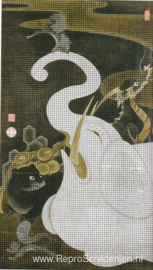 Wij bieden u een ambachtelijke reproductie op doek van het beroemde schilderij 'Witte olifant en dieren' van Ito Jakuchu, afkomstig uit het Reproductiemuseum.