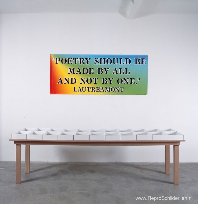 Wij bieden u een ambachtelijke reproductie op doek van het beroemde schilderij 'Gratis poëzie' van Allen Ruppersberg, afkomstig uit het Reproductiemuseum.