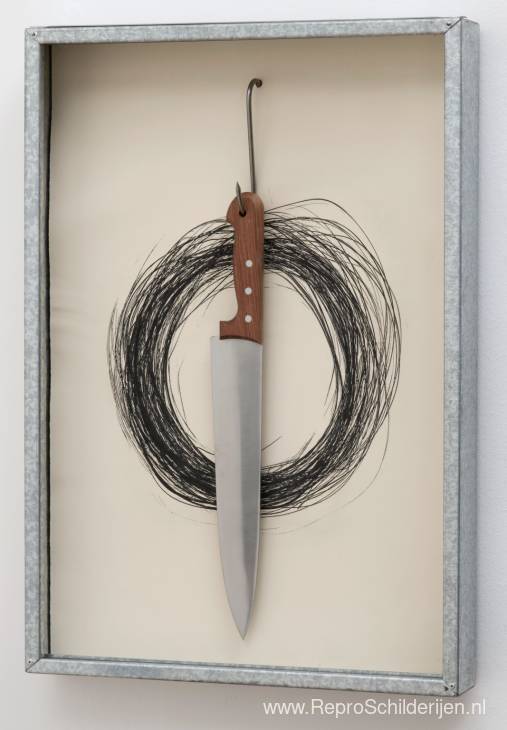 Wij bieden u een ambachtelijke reproductie op doek van het beroemde schilderij 'Zonder titel (Hangend mes)' van Jannis Kounellis, afkomstig uit het Reproductiemuseum.