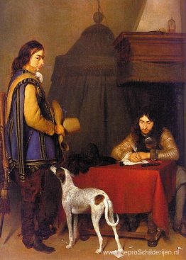 Het interieur van een wachtkamer met een soldaat die rook in het