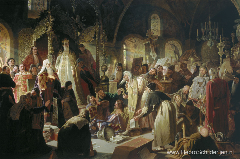 Wij bieden u een ambachtelijke reproductie op doek van het beroemde schilderij 'Nikita Pustosviat. Geschil over de geloofsbelijdenis' van Vasily Perov, afkomstig uit het Reproductiemuseum.