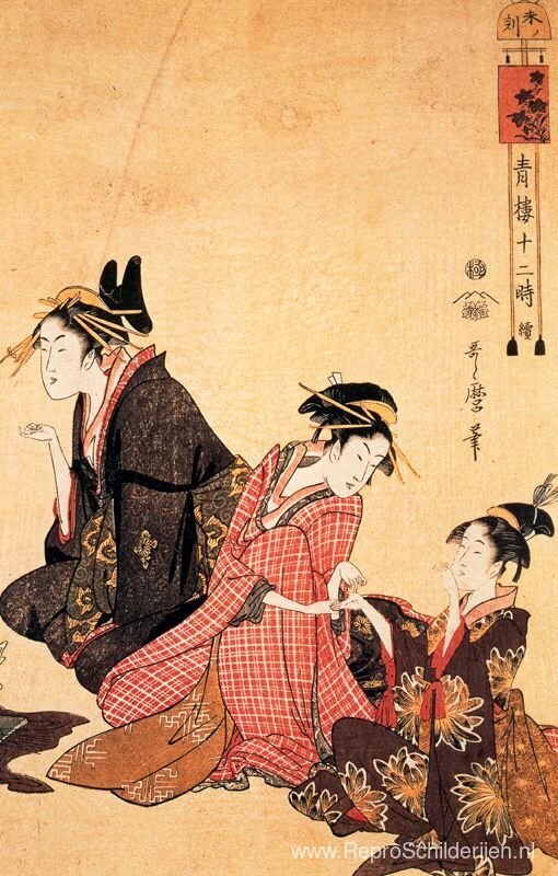 Wij bieden u een ambachtelijke reproductie op doek van het beroemde schilderij 'Een scène op de brug en de bel' van Kitagawa Utamaro, afkomstig uit het Reproductiemuseum.