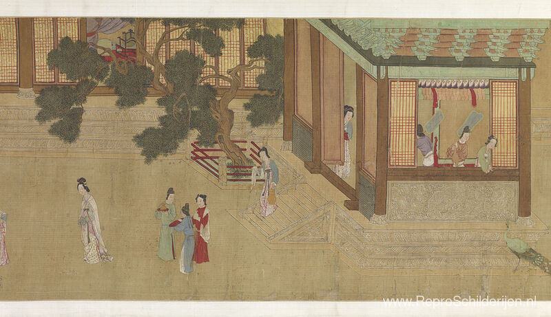 Wij bieden u een ambachtelijke reproductie op doek van het beroemde schilderij 'Lenteochtend in het Han-paleis (Bekijk C)' van Qiu Ying, afkomstig uit het Reproductiemuseum.