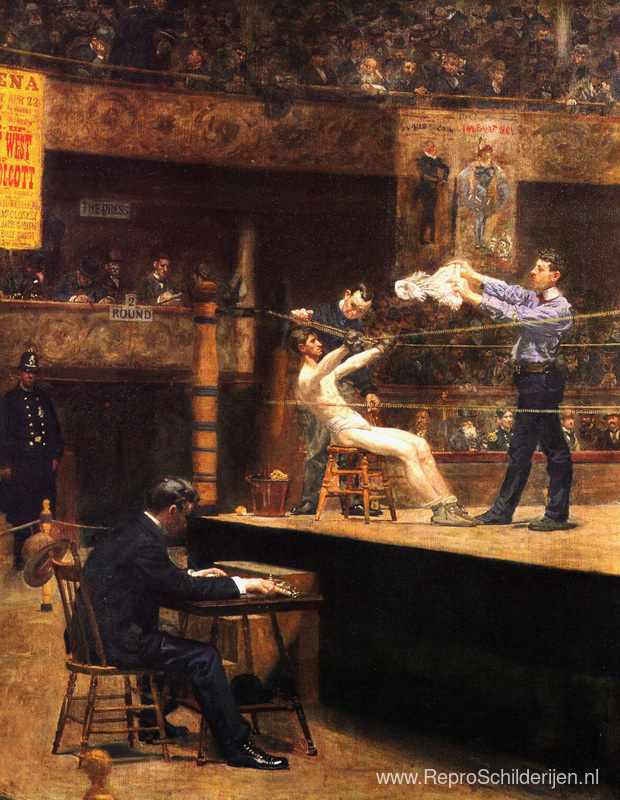Wij bieden u een ambachtelijke reproductie op doek van het beroemde schilderij 'Tussen rondes' van Thomas Eakins, afkomstig uit het Reproductiemuseum.