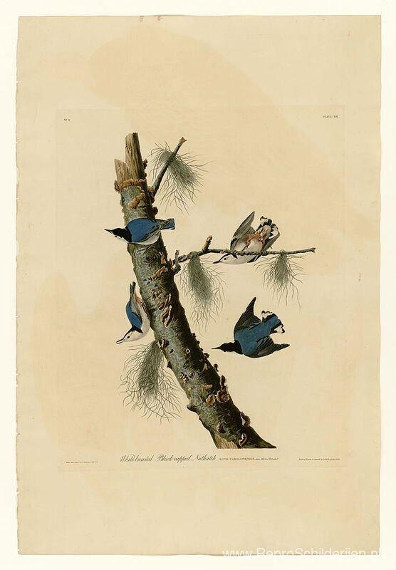 Wij bieden u een ambachtelijke reproductie op doek van het beroemde schilderij 'Bord 152 Boomklever met witte borst en zwarte dop' van John James Audubon, afkomstig uit het Reproductiemuseum.