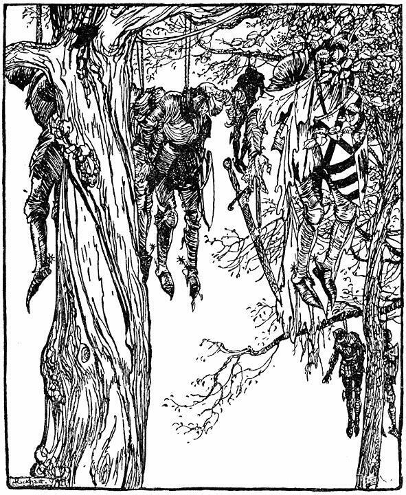 Wij bieden u een ambachtelijke reproductie op doek van het beroemde schilderij 'De slachtoffers van de Rode Ridder' van Arthur Rackham, afkomstig uit het Reproductiemuseum.