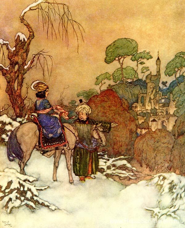 Wij bieden u een ambachtelijke reproductie op doek van het beroemde schilderij 'Het kasteel van het beest - van Belle en het beest' van Edmund Dulac, afkomstig uit het Reproductiemuseum.