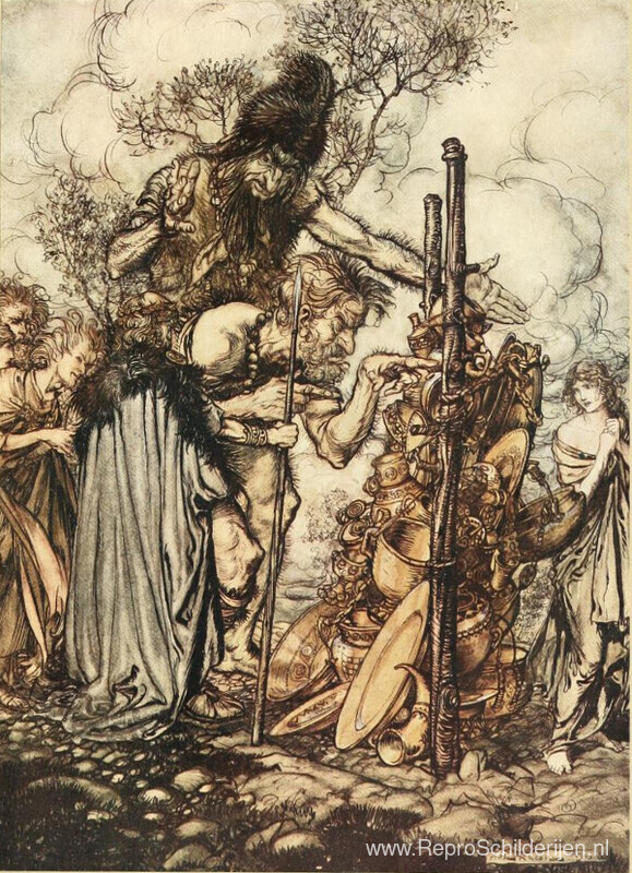 Wij bieden u een ambachtelijke reproductie op doek van het beroemde schilderij 'Hoi! Kom hier' van Arthur Rackham, afkomstig uit het Reproductiemuseum.