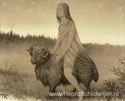 Wij bieden u een ambachtelijke reproductie op doek van het beroemde schilderij 'Ikke Kjoerende en Ikke Rinden' van Theodor Severin Kittelsen, afkomstig uit het Reproductiemuseum.
