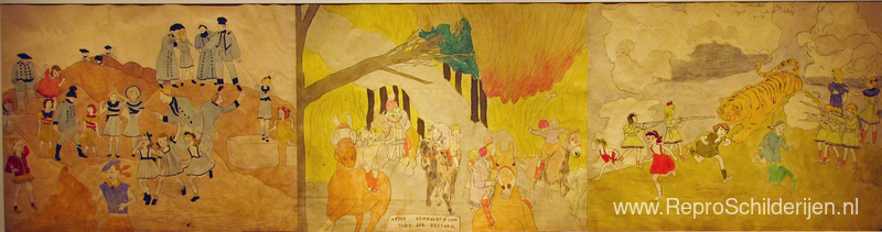 Wij bieden u een ambachtelijke reproductie op doek van het beroemde schilderij 'Na Osmondonson worden ze gered' van Henry Darger, afkomstig uit het Reproductiemuseum.