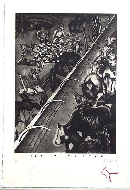Wij bieden u een ambachtelijke reproductie op doek van het beroemde schilderij 'Picknick' van Sue Coe, afkomstig uit het Reproductiemuseum.