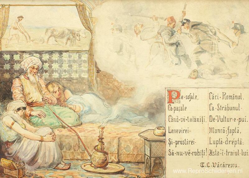 Wij bieden u een ambachtelijke reproductie op doek van het beroemde schilderij 'Roemeense verhalen' van Nicolae Vermont, afkomstig uit het Reproductiemuseum.