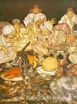 Wij bieden u een ambachtelijke reproductie op doek van het beroemde schilderij 'Toen de poes de ratten en muizen zag, wachtte ze niet tot het ha' van Arthur Rackham, afkomstig uit het Reproductiemuseum.