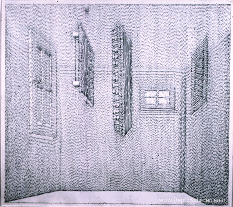 Wij bieden u een ambachtelijke reproductie op doek van het beroemde schilderij 'Deur, spiegel, tafel, mand, vloerkleed, raam' van Richard Artschwager, afkomstig uit het Reproductiemuseum.