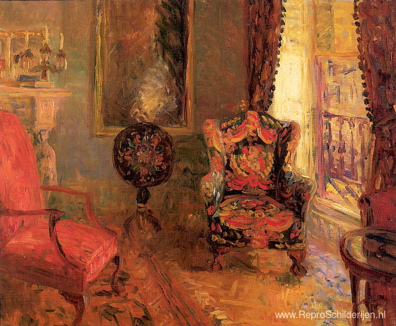 Wij bieden u een ambachtelijke reproductie op doek van het beroemde schilderij 'Drieëntwintig Fifth Avenue, interieur' van William James Glackens, afkomstig uit het Reproductiemuseum.