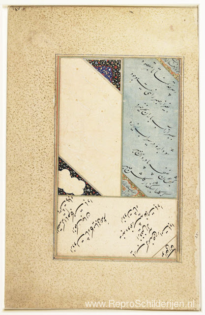 Wij bieden u een ambachtelijke reproductie op doek van het beroemde schilderij 'Paneel' van Mir Ali Tabrizi, afkomstig uit het Reproductiemuseum.
