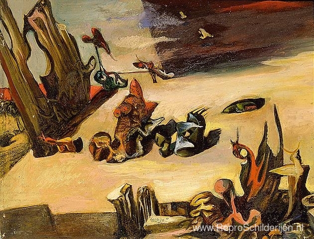 Wij bieden u een ambachtelijke reproductie op doek van het beroemde schilderij 'Betoverd strand' van Boris Margo, afkomstig uit het Reproductiemuseum.