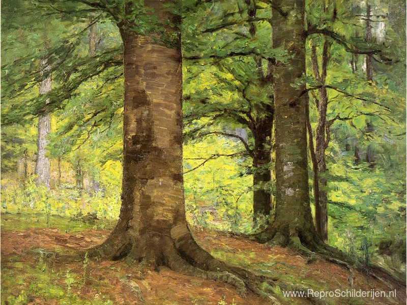 Wij bieden u een ambachtelijke reproductie op doek van het beroemde schilderij 'Beukenbomen' van T. C. Steele, afkomstig uit het Reproductiemuseum.