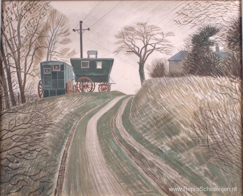 Wij bieden u een ambachtelijke reproductie op doek van het beroemde schilderij 'Caravans ' van Eric Ravilious, afkomstig uit het Reproductiemuseum.