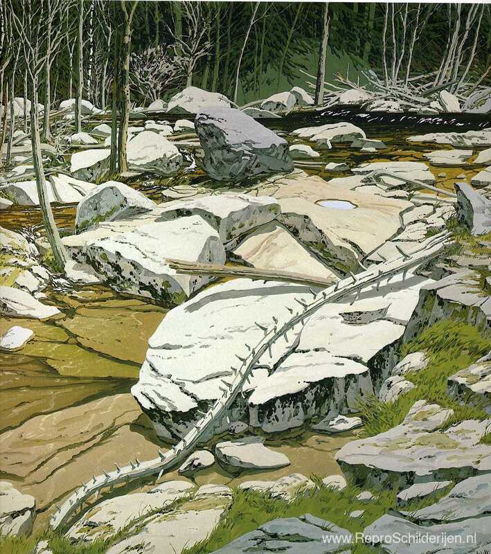Wij bieden u een ambachtelijke reproductie op doek van het beroemde schilderij 'De blauwe vijver' van Neil Welliver, afkomstig uit het Reproductiemuseum.