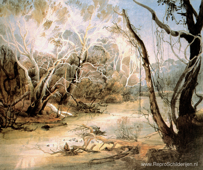 Wij bieden u een ambachtelijke reproductie op doek van het beroemde schilderij 'De Fox River nabij New Harmony in Indiana' van Karl Bodmer, afkomstig uit het Reproductiemuseum.