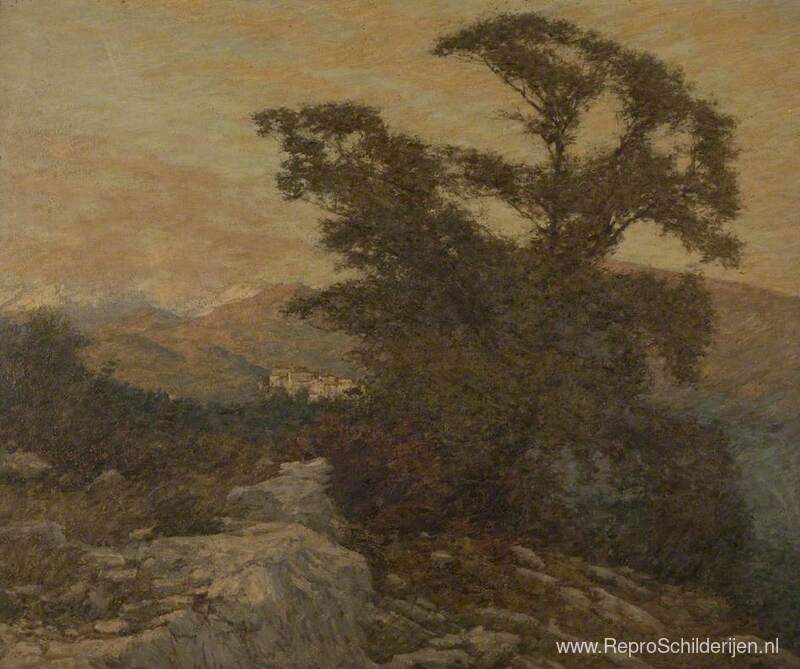 Wij bieden u een ambachtelijke reproductie op doek van het beroemde schilderij 'Een berggrens' van Henry Herbert La Thangue, afkomstig uit het Reproductiemuseum.
