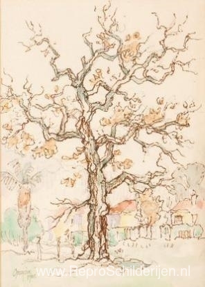 Wij bieden u een ambachtelijke reproductie op doek van het beroemde schilderij 'Een grote eik voor huizen' van Gregoire Boonzaier, afkomstig uit het Reproductiemuseum.