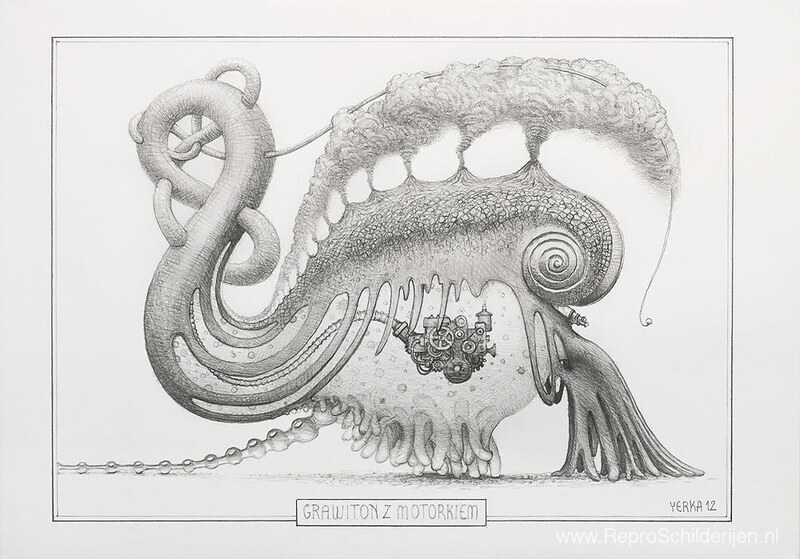Wij bieden u een ambachtelijke reproductie op doek van het beroemde schilderij 'Graviton met motormotor' van Jacek Yerka, afkomstig uit het Reproductiemuseum.