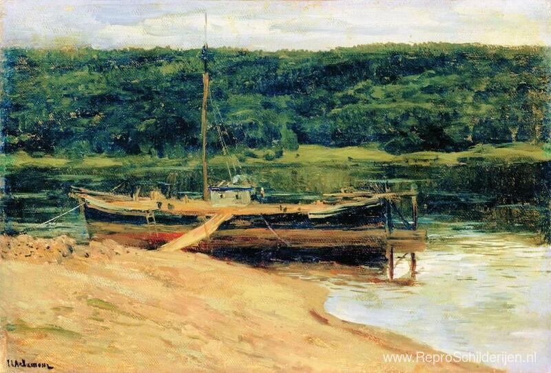 Wij bieden u een ambachtelijke reproductie op doek van het beroemde schilderij 'Grijze dag. Bos over rivier.' van Isaac Levitan, afkomstig uit het Reproductiemuseum.