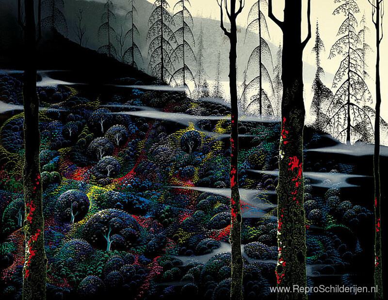 Wij bieden u een ambachtelijke reproductie op doek van het beroemde schilderij 'Het eerste licht van de dageraad' van Eyvind Earle, afkomstig uit het Reproductiemuseum.