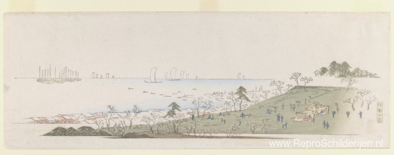 Wij bieden u een ambachtelijke reproductie op doek van het beroemde schilderij 'Kersenbloesemtijd, mensen die picknicken in Gotenyama' van Hiroshige, afkomstig uit het Reproductiemuseum.