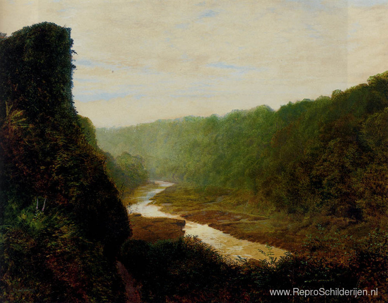 Wij bieden u een ambachtelijke reproductie op doek van het beroemde schilderij 'Landschap met een kronkelende rivier' van John Atkinson Grimshaw, afkomstig uit het Reproductiemuseum.