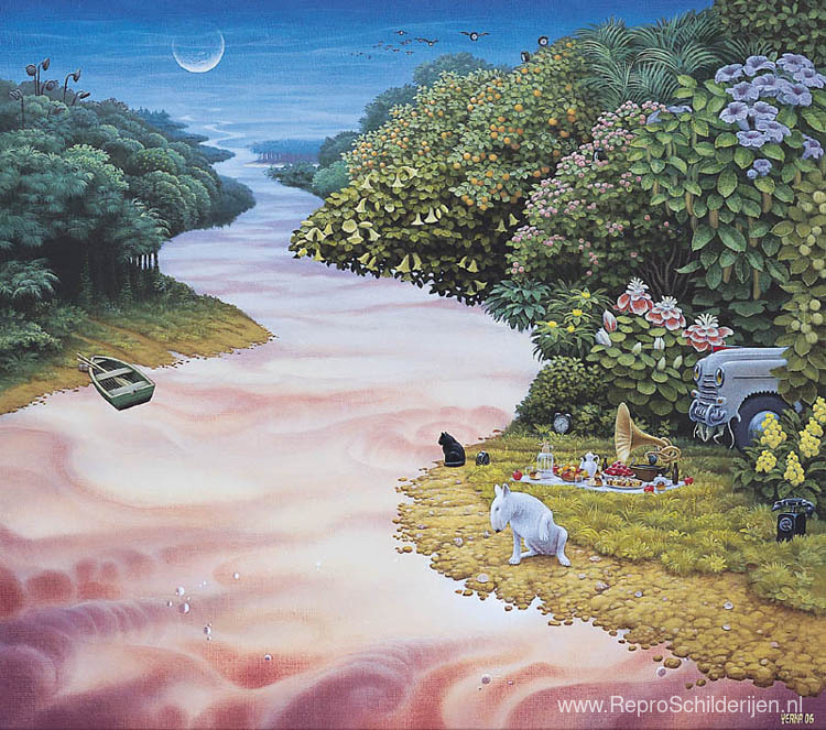 Wij bieden u een ambachtelijke reproductie op doek van het beroemde schilderij 'Onderbroken picknick' van Jacek Yerka, afkomstig uit het Reproductiemuseum.