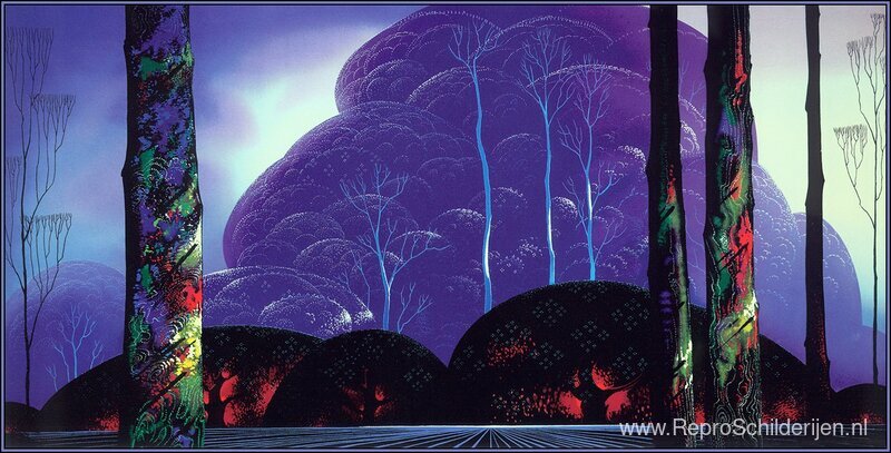 Wij bieden u een ambachtelijke reproductie op doek van het beroemde schilderij 'Paarse zonsondergang' van Eyvind Earle, afkomstig uit het Reproductiemuseum.