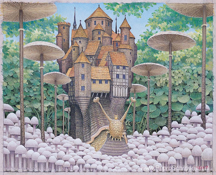 Wij bieden u een ambachtelijke reproductie op doek van het beroemde schilderij 'Paddestoel steegje' van Jacek Yerka, afkomstig uit het Reproductiemuseum.