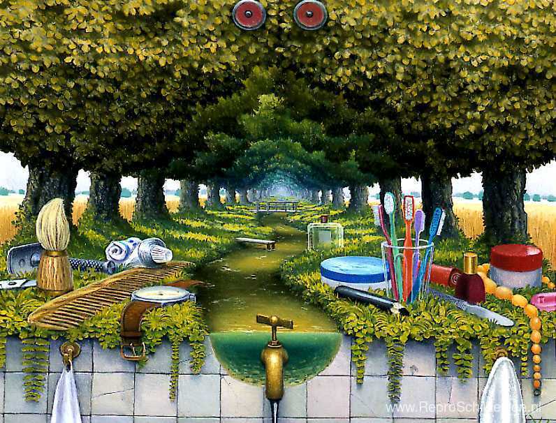 Wij bieden u een ambachtelijke reproductie op doek van het beroemde schilderij 'Persoonlijke plank' van Jacek Yerka, afkomstig uit het Reproductiemuseum.