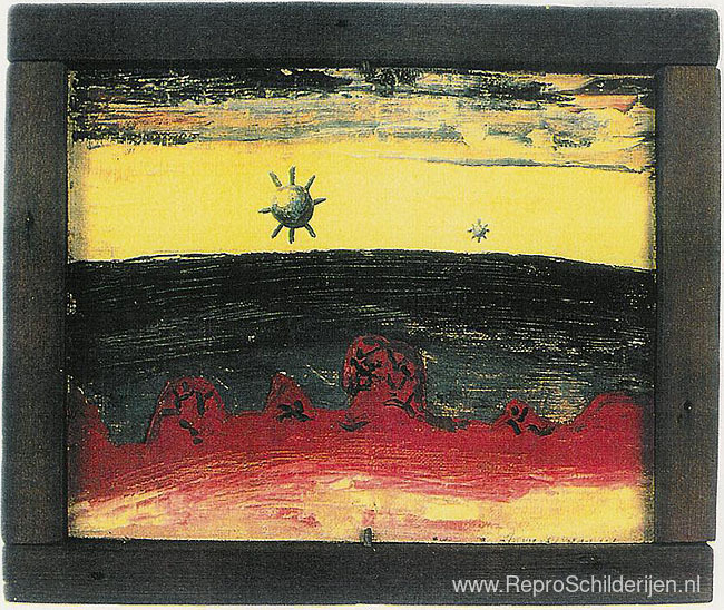 Wij bieden u een ambachtelijke reproductie op doek van het beroemde schilderij 'Profetie' van Forrest Bess, afkomstig uit het Reproductiemuseum.