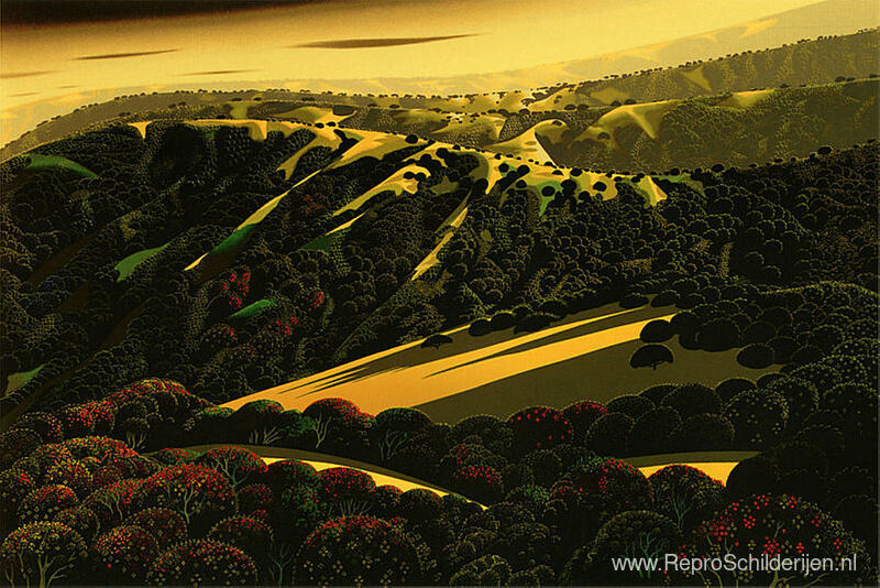 Wij bieden u een ambachtelijke reproductie op doek van het beroemde schilderij 'Santa Cruz-gebergte' van Eyvind Earle, afkomstig uit het Reproductiemuseum.