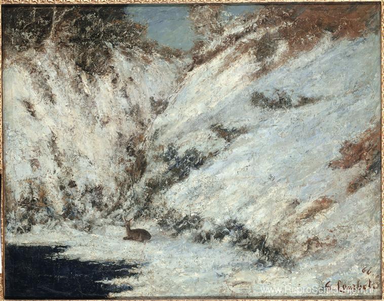 Wij bieden u een ambachtelijke reproductie op doek van het beroemde schilderij 'Sneeuwlandschap in de Jura' van Gustave Courbet, afkomstig uit het Reproductiemuseum.
